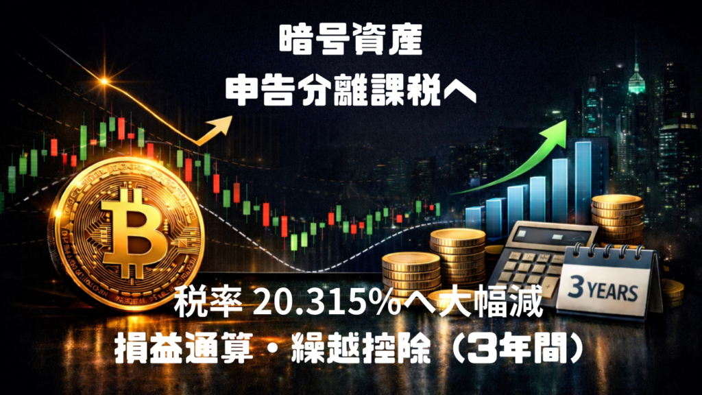 仮想通貨が申告分離課税へ|税率20.315%・損益通算・3年繰越控除の要点【令和8年度税制改正大綱】